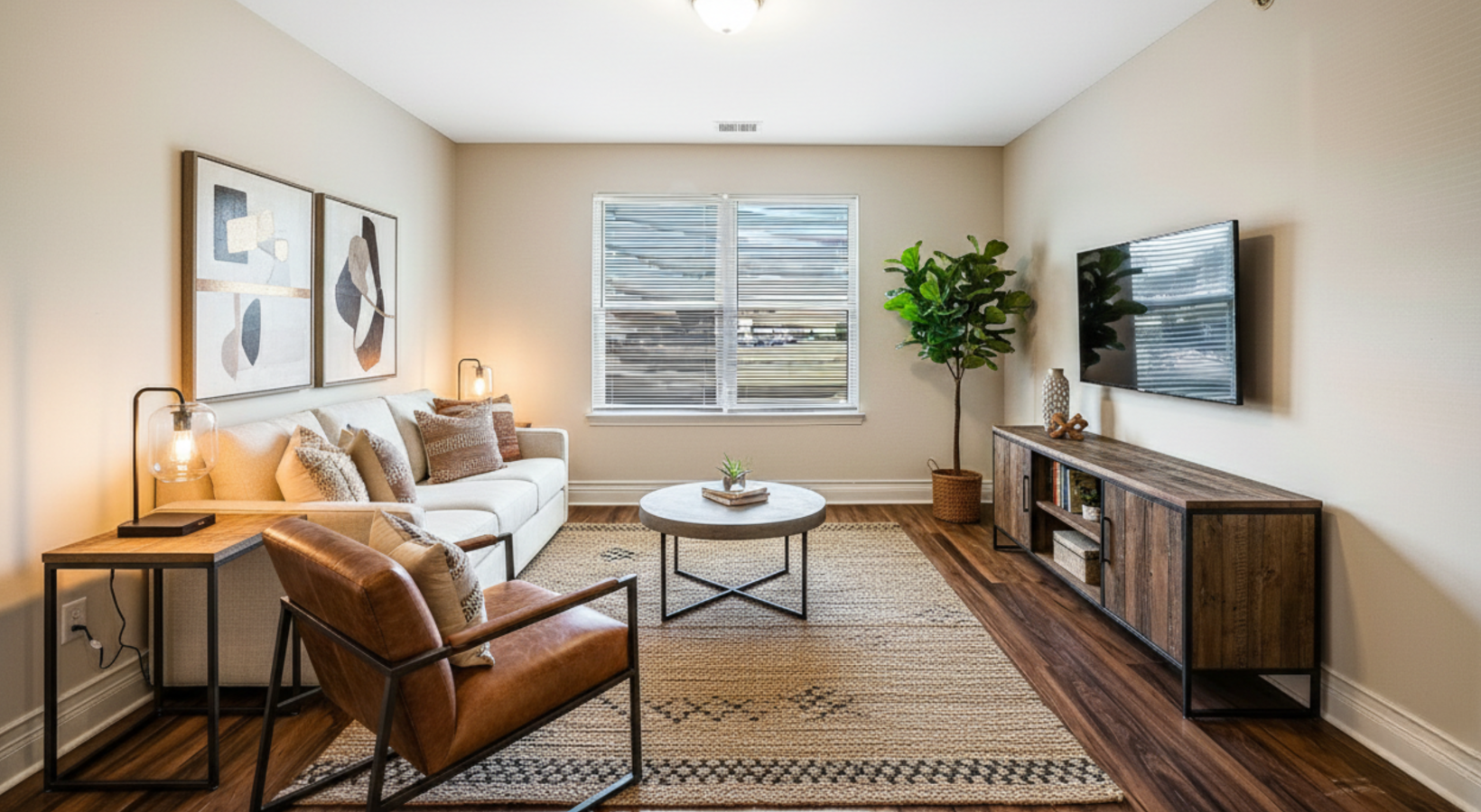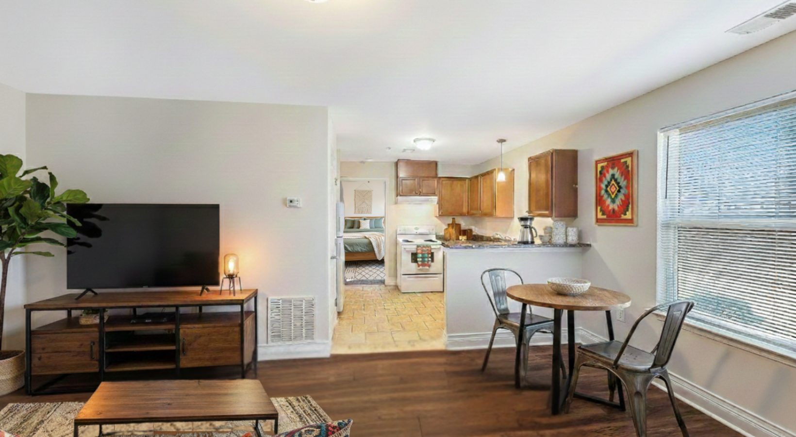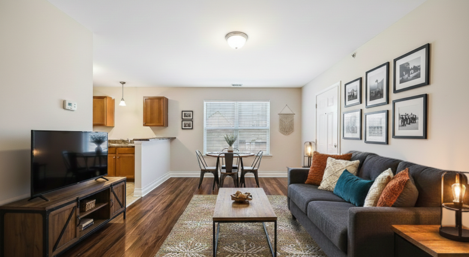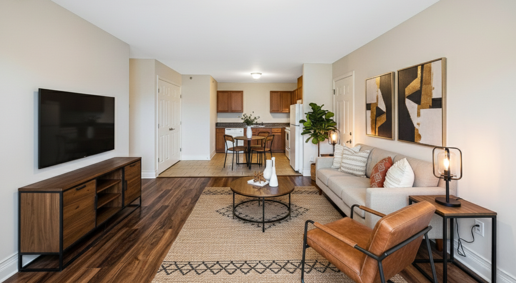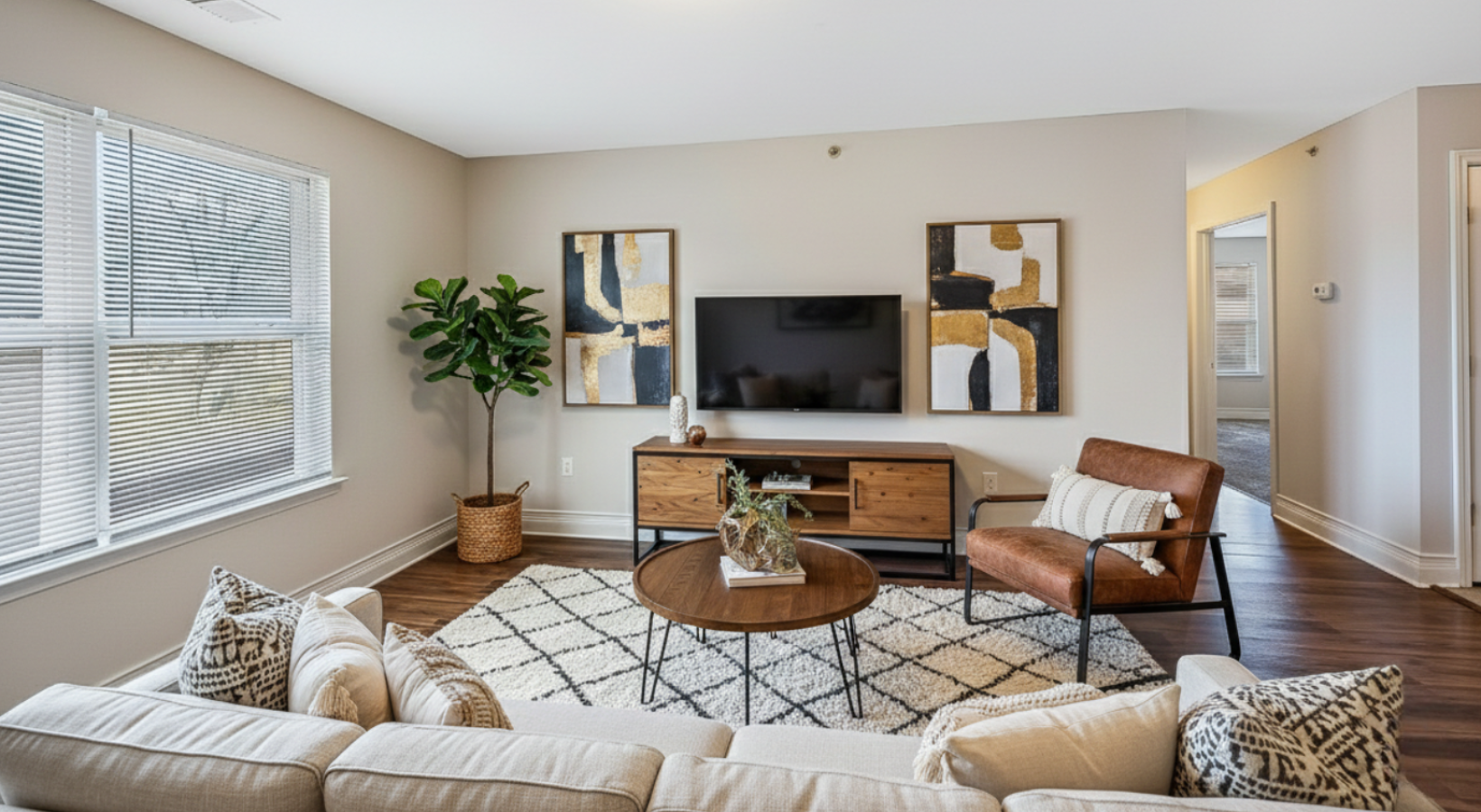 • Spacious living room with a hallway leading to the bedrooms