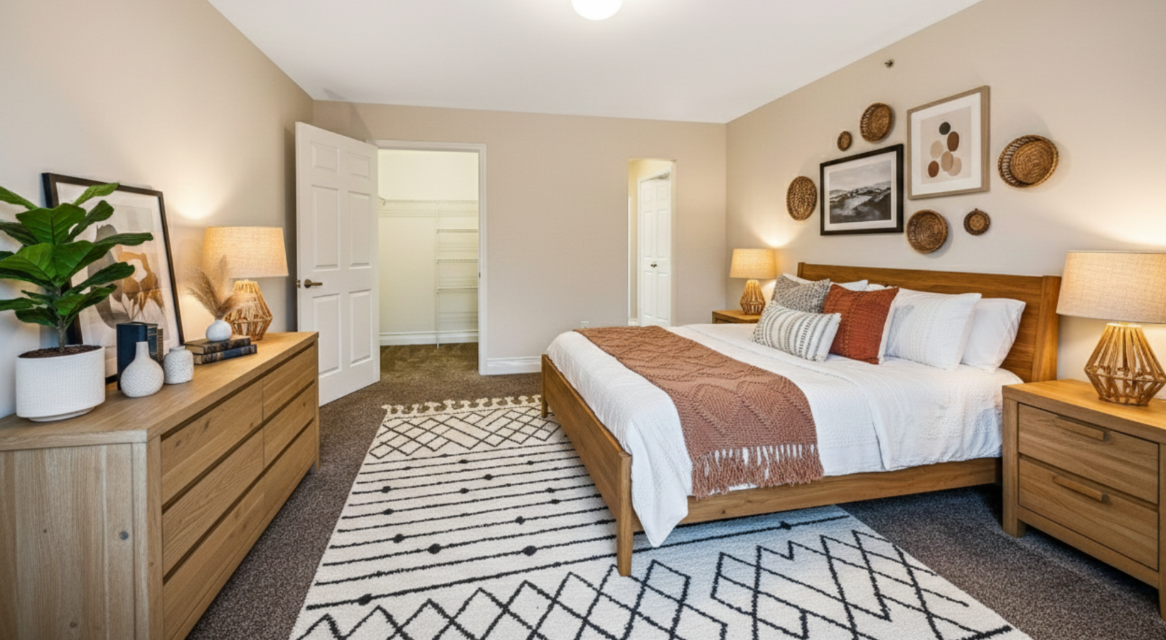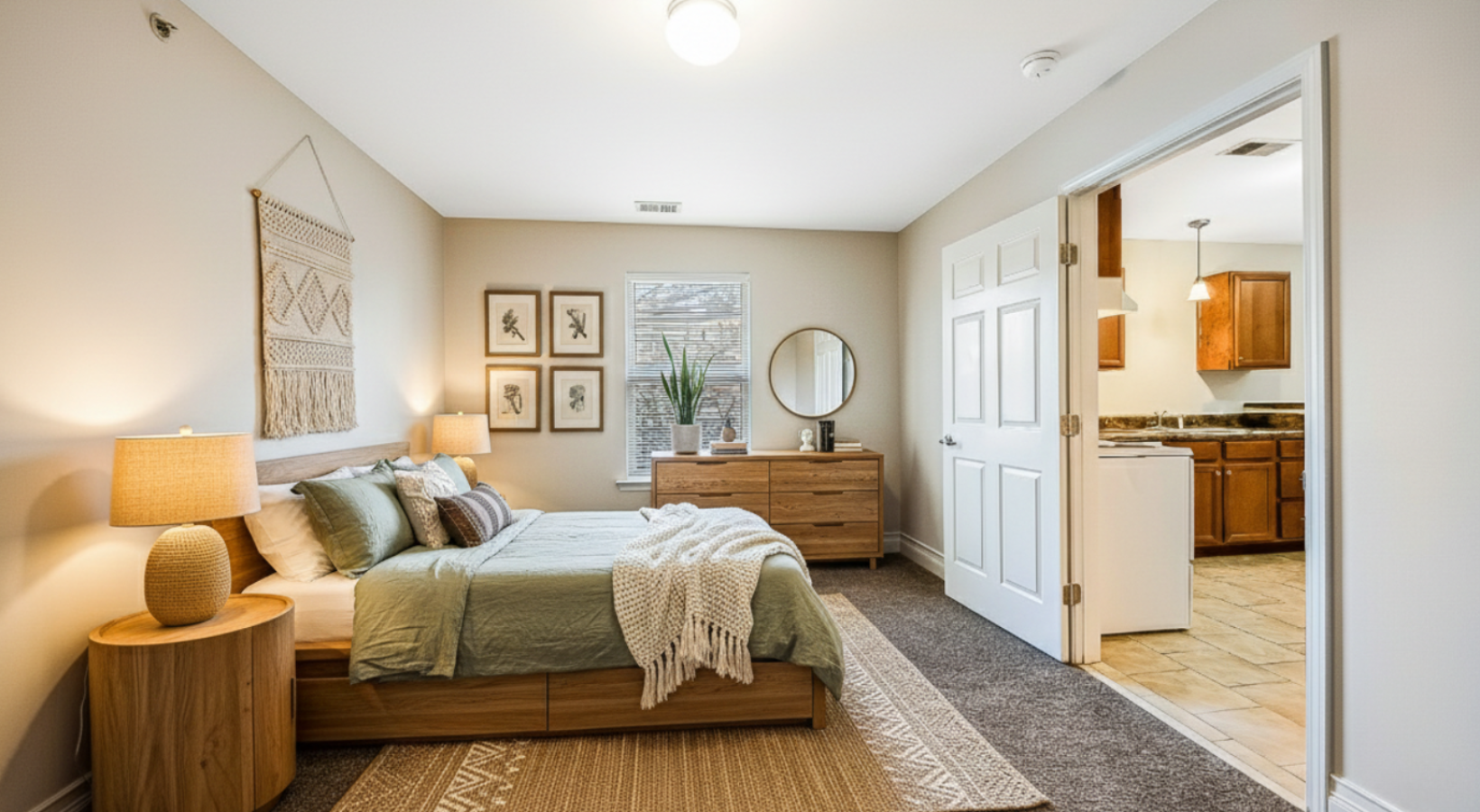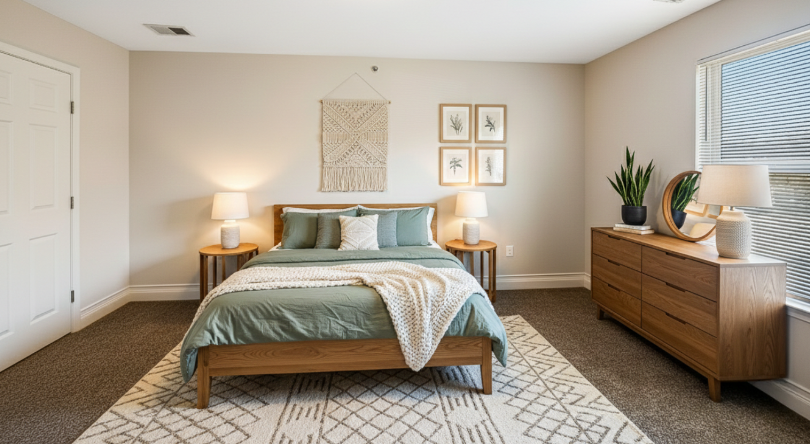 • spacious, carpeted bedroom with light fixture