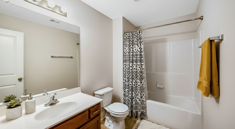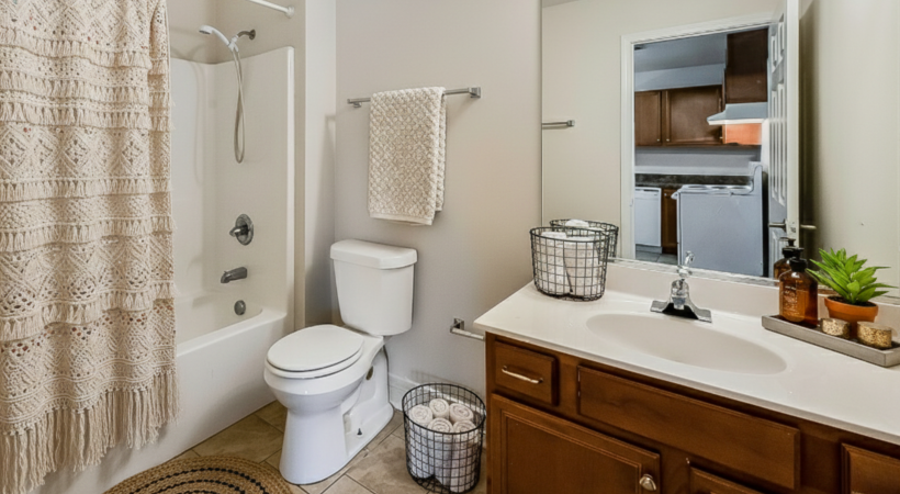 • Bathroom with shower curtain, plant, and towels in a basket