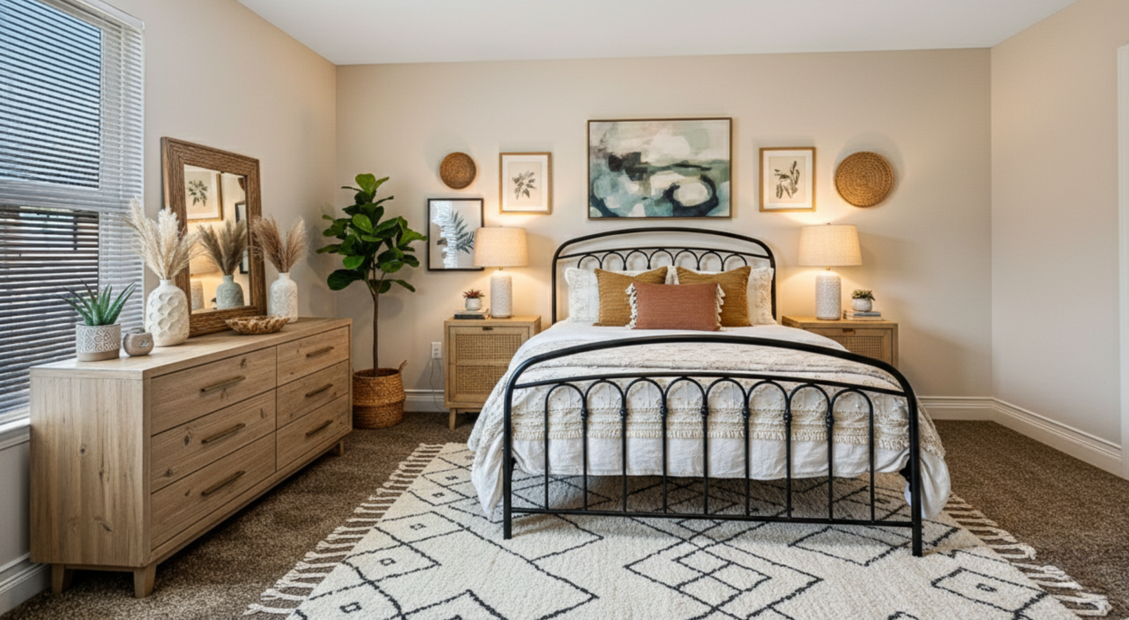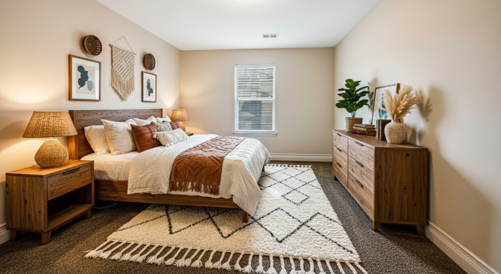 • well lit bedroom with a bed, end tables, a dresser and a window