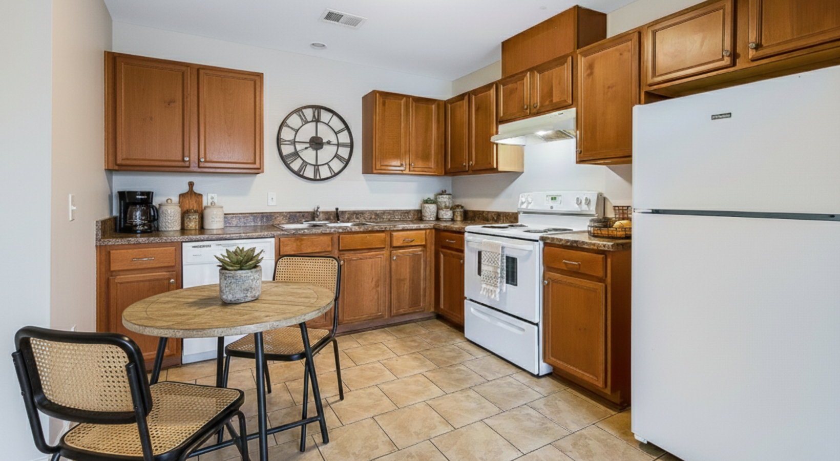 • Kitchen with table, white appliances, and kitchen decor